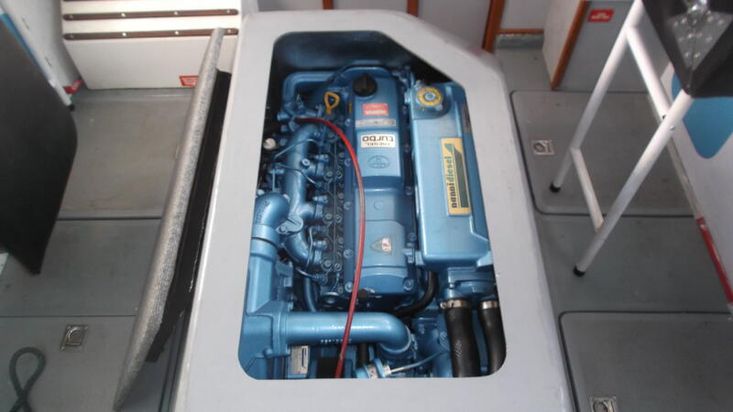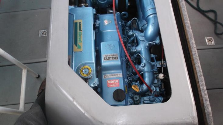 Engine has less than 600 hours and is the Nanni conversion of the famous Landcruiser Toyota engine giving 155 HP, enough to move the boat along at 18 Knots(I have done it!)