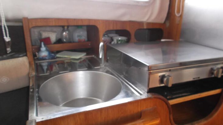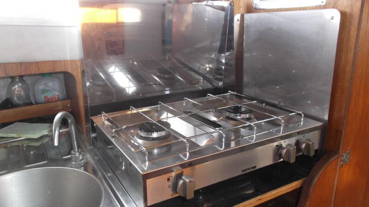 Carpet in cabin plus unused cooker/grill in covered S/S lid. Gas bottle in drained box in cokpit with Detector in cabin. Loads of storage in lockers and shelves, forward cupboards house anchor chain.