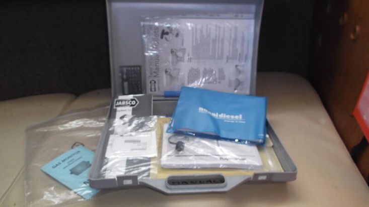 Bilge pumps, electric and manual, extinguishers, two lifjackets,a throwing line,Flares in a container, oak plugs and a bucket.