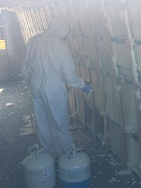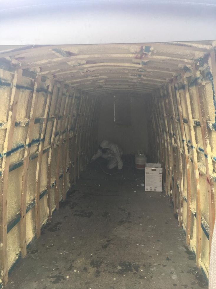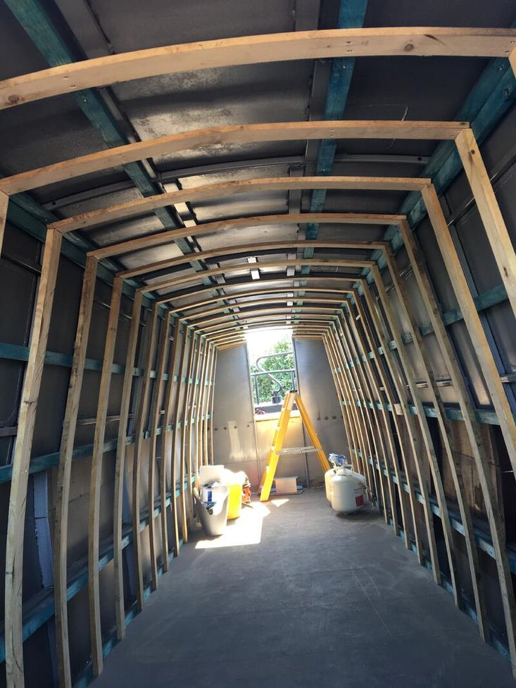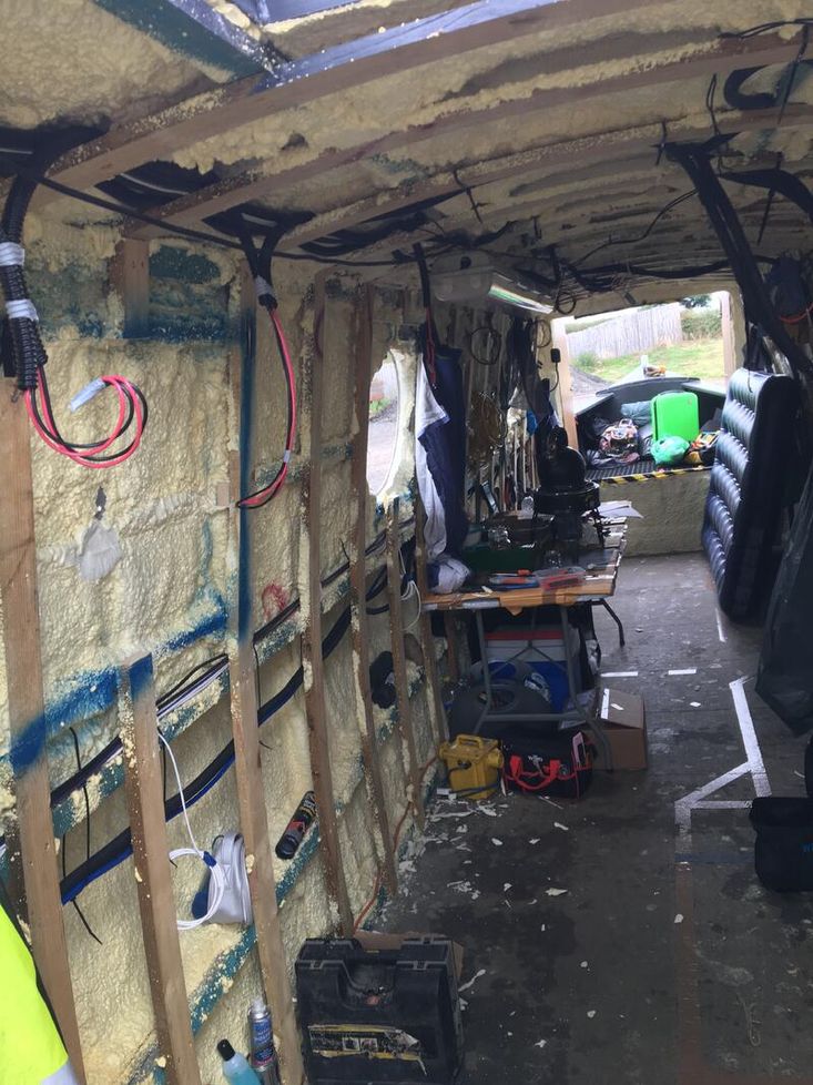 New sub floor with underfloor insulation and timbers throughout. Then sprayed with spray foam fully. Interior cladded in softwood cladding tongue and groove - solid real oak floor boards bonded and glued in place. A spare box to finish edges as required and for future use.