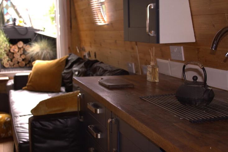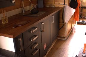 New simple galley with stainless steel compact sink plumbing and oak work top. Internal cabin pump and access panel for checking any condensation or other water build up.