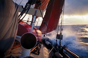 All tan Dacron . Main, mizzen, staysail, no 1 and 2 jib .large white Genoa, cruising chute.blue Mizzen stat sail, tan topsail.