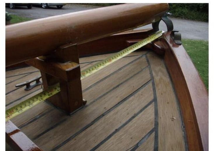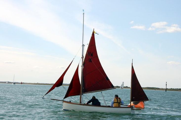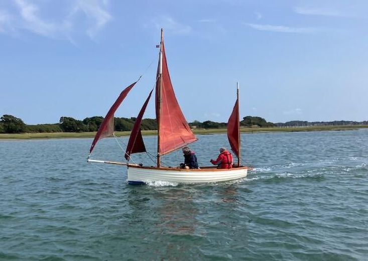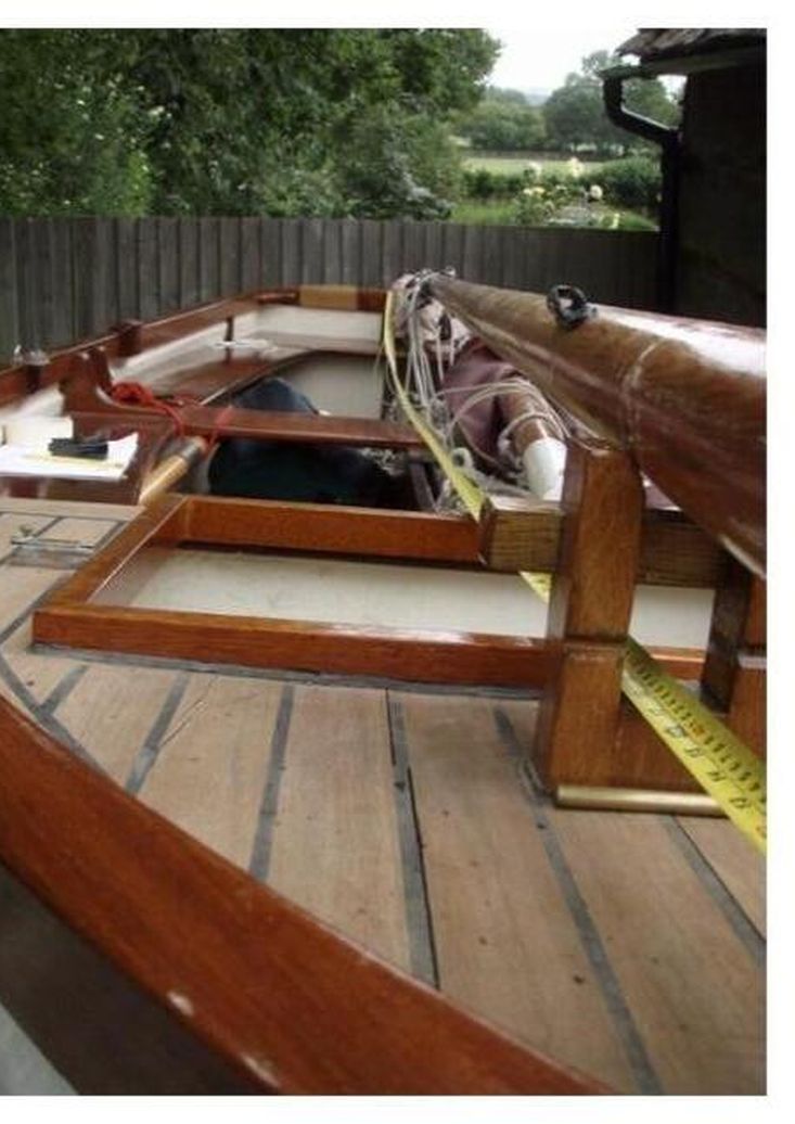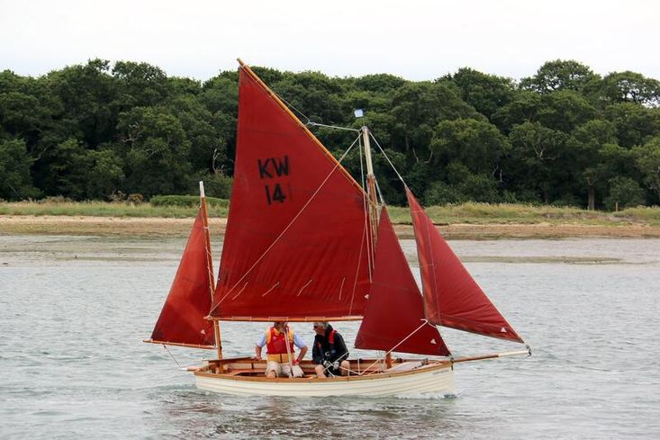 Firebrand is a gaff-rigged yawl of 14' 3" on deck, 21' (6.4-m) LOA and 14' (4.3-m) LWL with a beam of 5' (1.5-m); draft 9" with the plate up and 3' with plate down. She has a GRP simulated clinker hull with cream gelcoat topsides and blue underwater paint coating. The mahogany gunwales, fitted for rowlocks, main thwart, side and stern benches were all varnished or re-coated with Deks Olje for the 2024 season. Beneath the laid and payed Iroko foredeck and hatch is a forward buoyancy chamber. The strengthened transom is fitted for mounting the Yamaha 4 outboard that has always run well. The slatted sole boards are scrubbed pine.