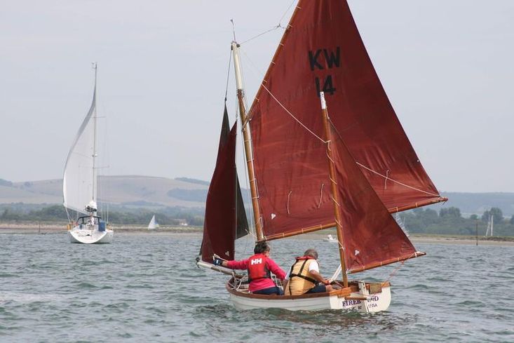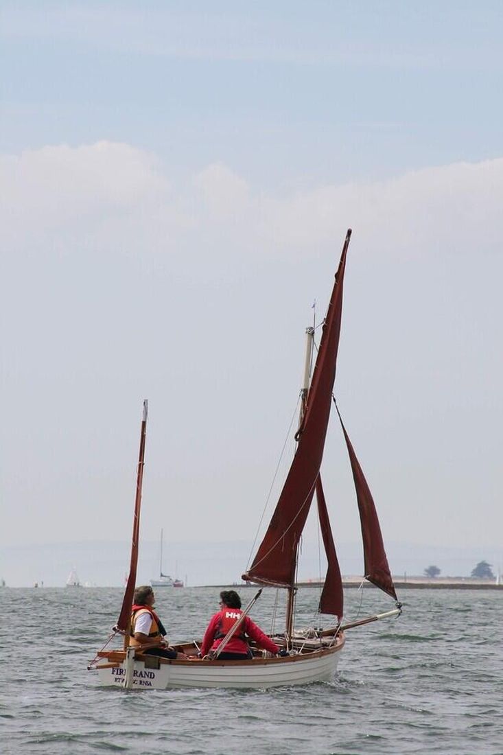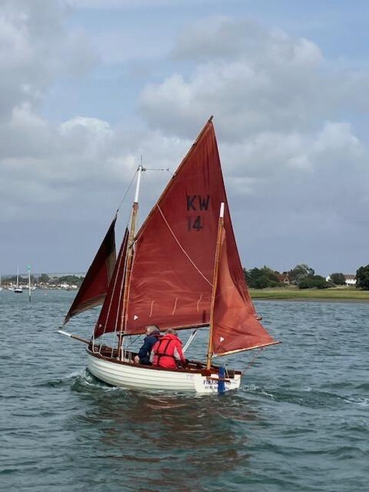 Hull - Firebrand was built by Roger Wilkinson of Kittiwake Boats, Macclesfield in 1989/90. She was professionally rebuilt for the Antiques Road Show silver expert, Brand Ingles, by Roger in 1995, when he added two built in buoyancy tanks beneath the side benches in addition to the original aft buoyancy chamber. Brand took her down to Provence and sailed her there until 2010, when I bought her from him. The hull was designed by Morgan Giles in 1920 as the Trearddur Bay Sailing Club One Design Myth Class racing dinghy. The hull form was adapted by Roger into the Kittiwake 14, which despite being a fibreglass hull features a great deal of mahogany trimming, often mistaken for wooden boats they has always been welcomed at Classic Boat Shows as they look so traditional. They are sturdy boats: Roger's original prototype won the Kittiwake Challenge Cup in Falmouth in 2024.
