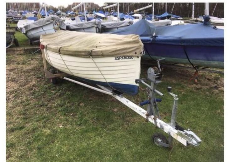 Equipment - launching trolley and Snipe road trailer - the latter is in running condition but has been repaired with square section doubler tubes; trail board; the original winter boat cover is still in use but needs replacing; there is a drop plate rudder; a pair of 8' ash oars with bronze rowlocks; a Yamaha 4 outboard; 12-L Yamaha fuel tank, pipe and hand pump; manual bilge pump; CQR and grapnel anchors and warps; mooring warps; several hand bailers; sail bag; collapsable rubber bucket; trailer wheel lock.