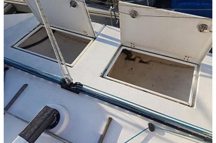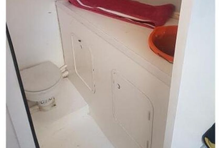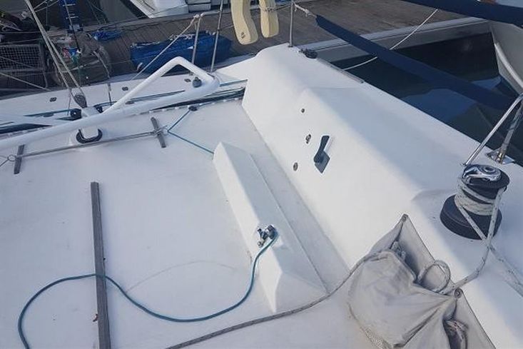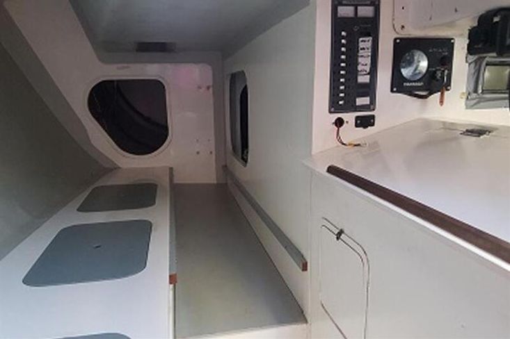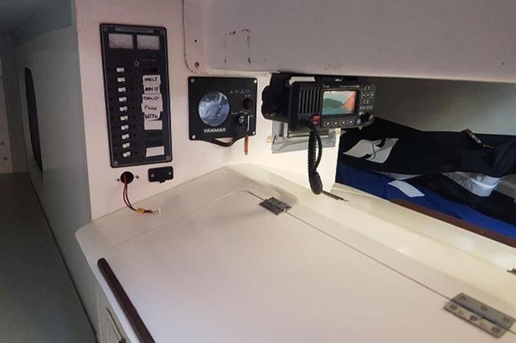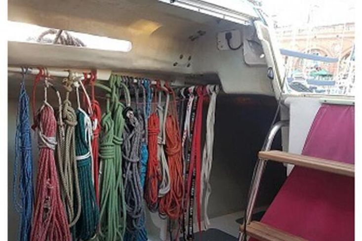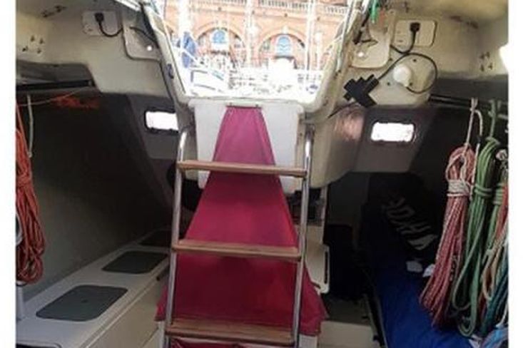 The accommodation offers up to eight cushioned berths (new padding 2020) in saloon and quarter berths. Sail stowage forward. Galley area to port with two burner cartridge gas stove and sink. Separate heads compartment with zip canvas 'door' to starboard with Jabsco marine toilet and wash basin. Double-sided navigation station under companionway allows the navigator to sit to windward. Removable stainless steel tube frame companionway ladder with teak steps. Canvas storage bag/spray screen under companionway ladder.