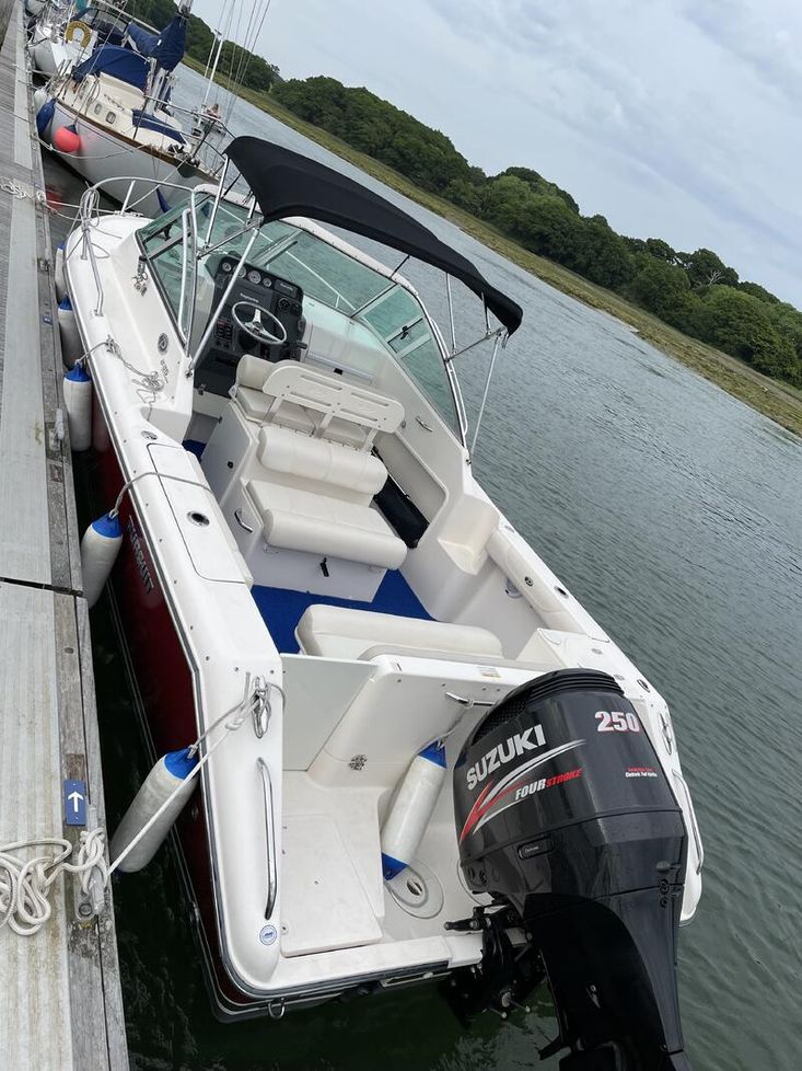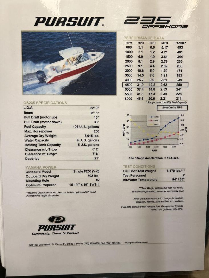Known for its performance and stability, this Pursuit 235 Sport Center console is fitted with an 250 Suzuki outboard engine, being the ideal boat for the one who’s searching for a fast, comfortable, versatile sport cruiser, but also made for overnight with its V berth and heads.