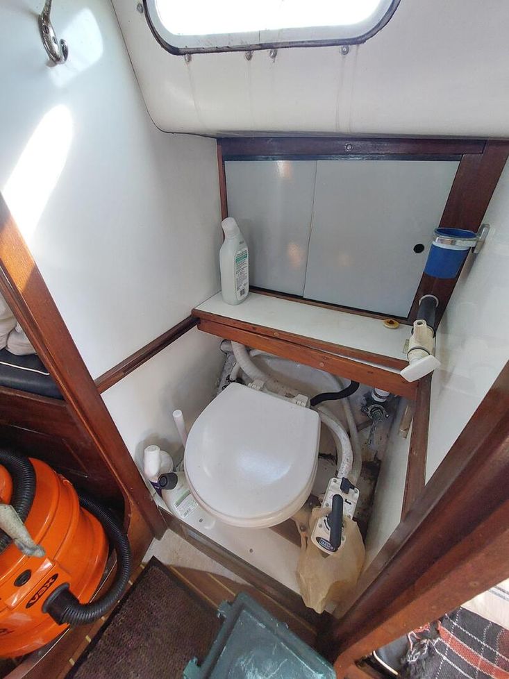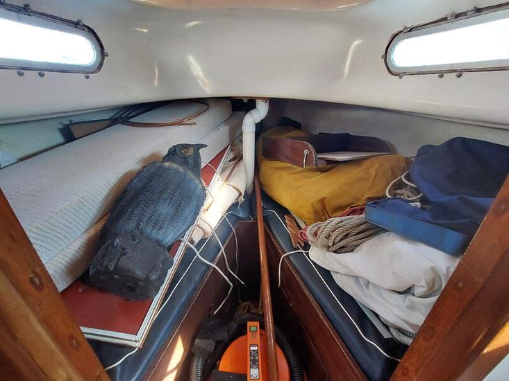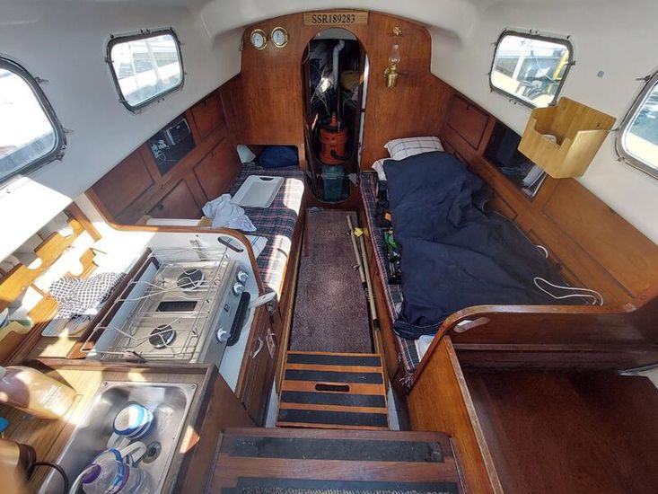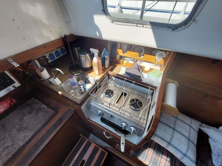 Double berth in the forepeak, 2 single berths in the saloon, quarterberth to starboard, 2 burner gas cooker, galley sink, cloth upholstery, chart table, sea toilet, CD stereo.