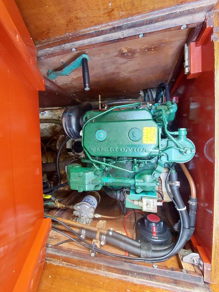 Volvo Penta 2002, 18hp, 2 cylinder diesel. Drive type: shaft. Twin batteries charged from the engine. 240v battery charger.